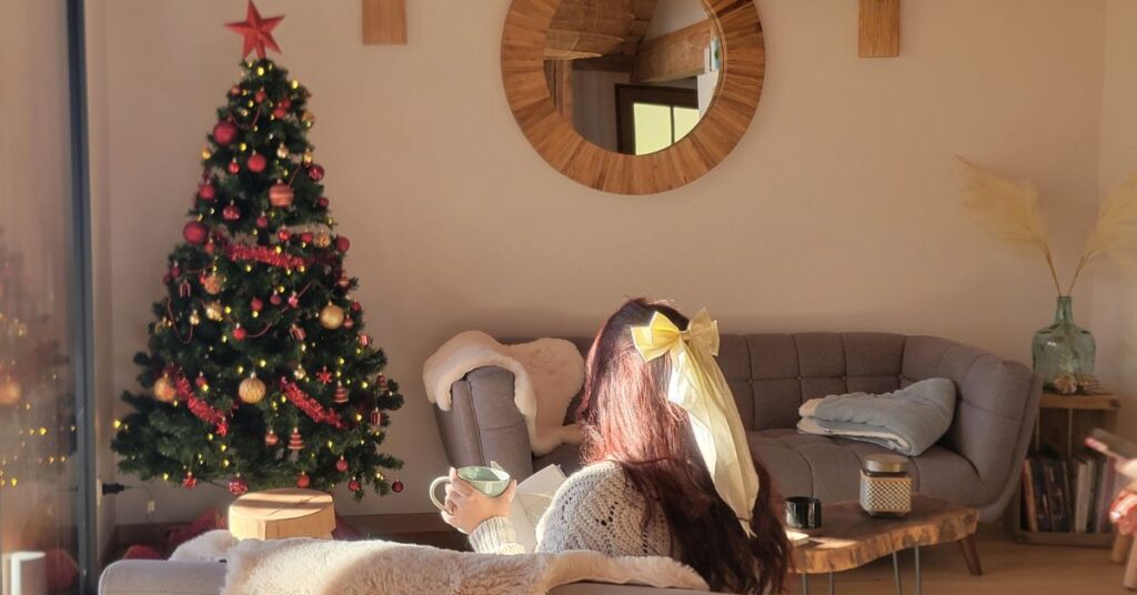 Un salon cosy avec deux canapés, une table basse, un tapis, une suspension boule en rotin, un grand miroir rond en bois et de larges baies vitrées.