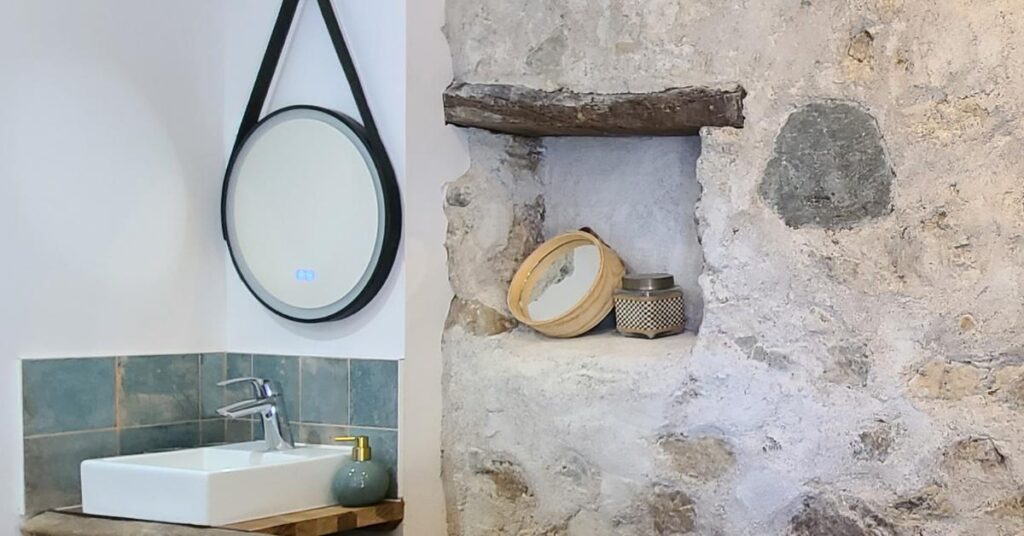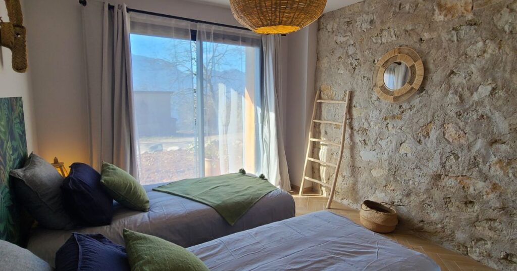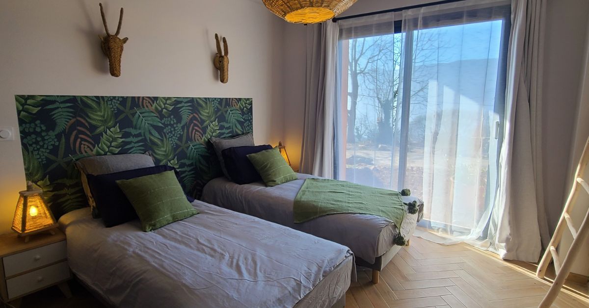 Un salon cosy avec deux canapés, une table basse, un tapis, une suspension boule en rotin, un grand miroir rond en bois et de larges baies vitrées.