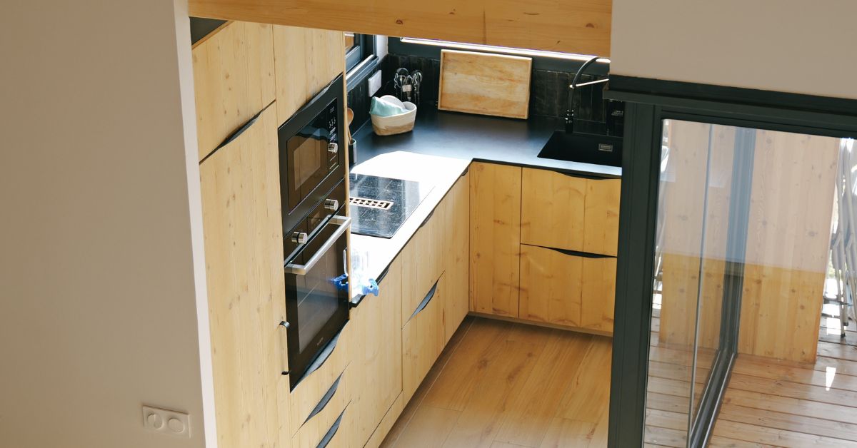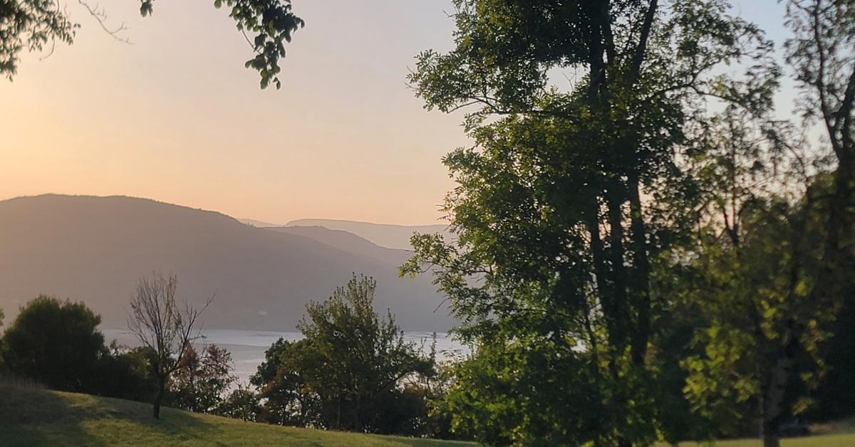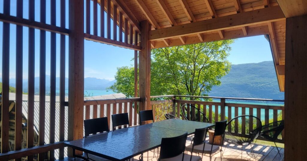 Le salon du gîte de l'Eterlou à L'Alpage avec ses deux canapés, son poêle à bois et ses larges baies vitrées.